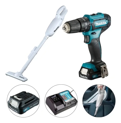 O Kit de Ferramentas Makita 12V é a solução definitiva para quem valoriza organização e agilidade. Composto por uma furadeira/parafusadeira de alto torque e um aspirador de pó vertical leve, este combo oferece a liberdade de trabalhar sem fios, utilizando a mesma plataforma de bateria para ambos os equipamentos. Principais Características: